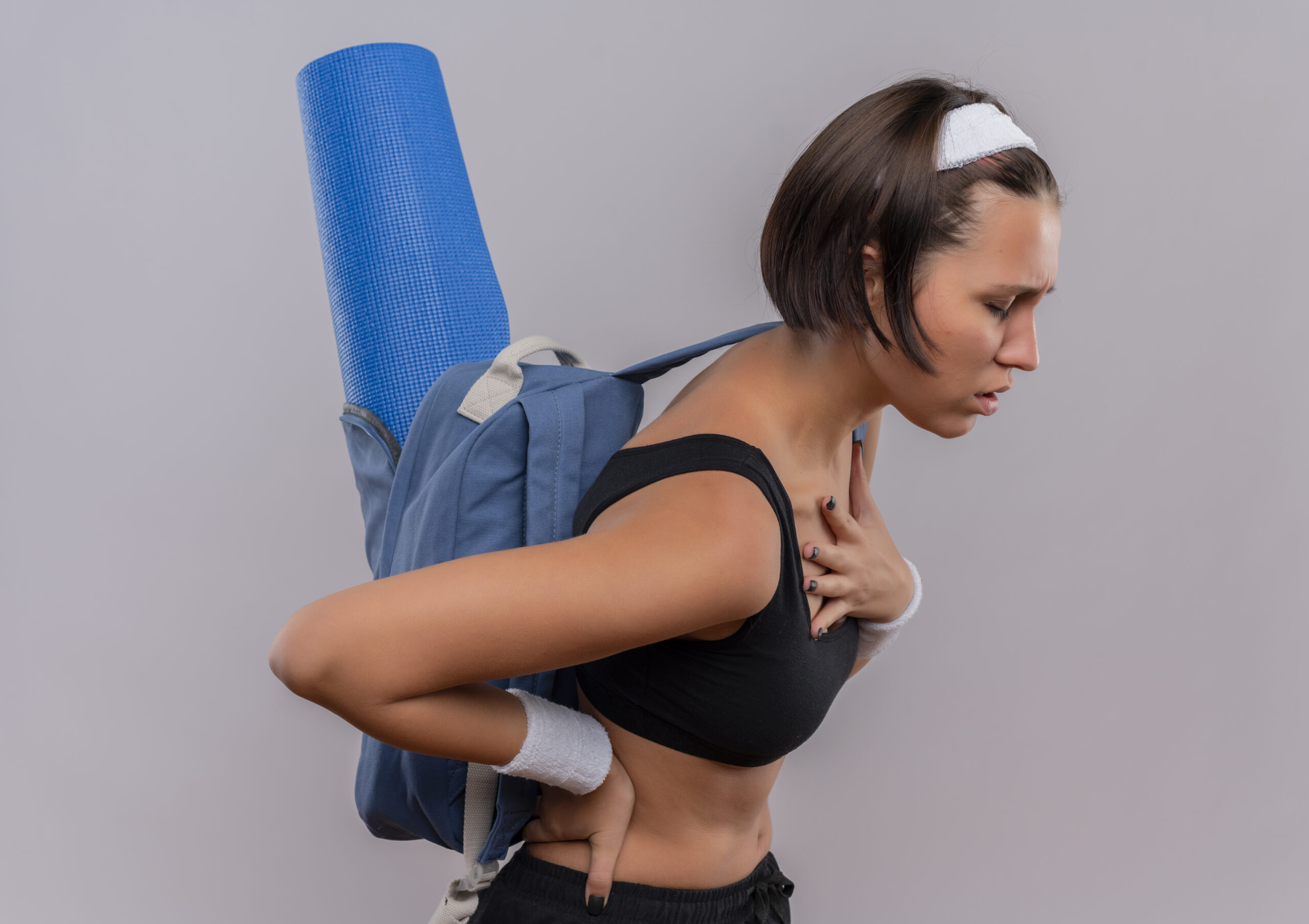 Young woman with back pain looking tired while carrying a yoga mat; exercises for brachial plexus injury recovery can help alleviate discomfort.